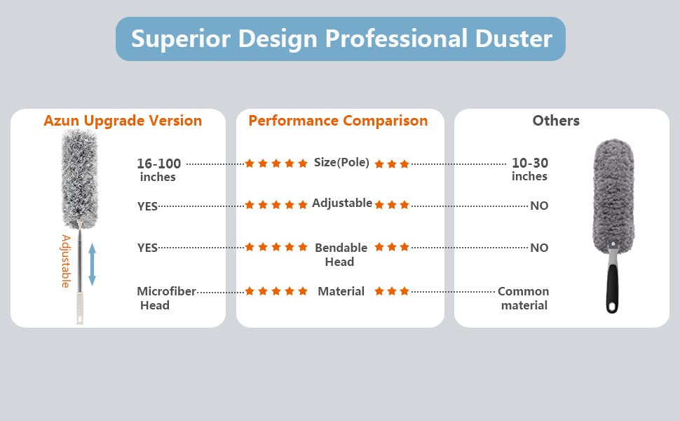 - EXTENDABLE DUSTER: The pole of our cleaning duster is extendable which can be extended from 30 inches to 100 inches, so you can clean the high places easily without needing to stand on the chair.